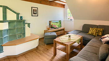 - Großer Wohnbereich mit gemütlicher Sofaecke und TV