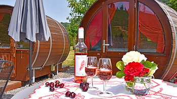 Wenn Sie eine ganz besondere Übernachtungsmöglichkeit suchen, haben wir genau das Richtige: Übernachten Sie doch mal ur-romantisch in einem Holzfass mit herrlicher Aussicht umgeben von Obstbäumen und Weinreben.